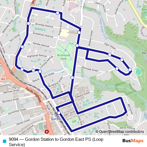 The first stop of the 9094 bus route is Gordon Station, Werona Av, Stand D and the last stop is Gordon Station, Werona Av, Stand D. 9094 (Gordon Station to Gordon East PS (Loop Service)) is operational during on weekdays.