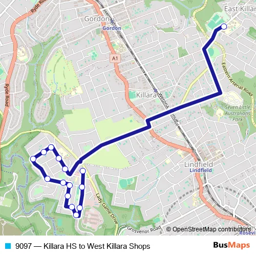 The first stop of the 9097 bus route is Killara High School, Koola Av and the last stop is Bradfield Rd At Bradfield Lane. 9097 (Killara HS to West Killara Shops) is operational during on weekdays.