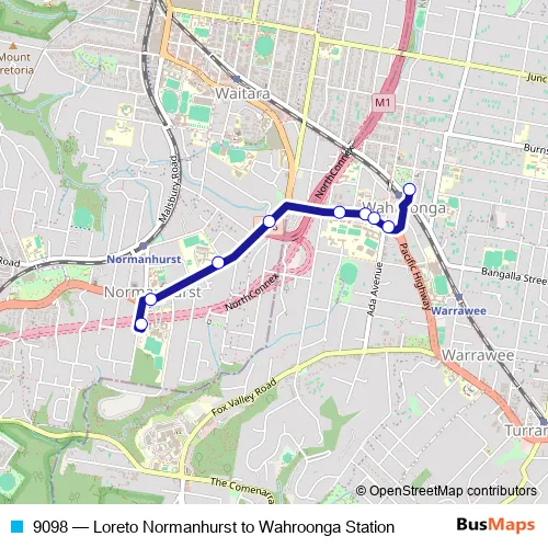 The first stop of the 9098 bus route is Loreto College South, Osborn Rd and the last stop is Wahroonga Station, Illoura Av. 9098 (Loreto Normanhurst to Wahroonga Station) is operational during on weekdays.