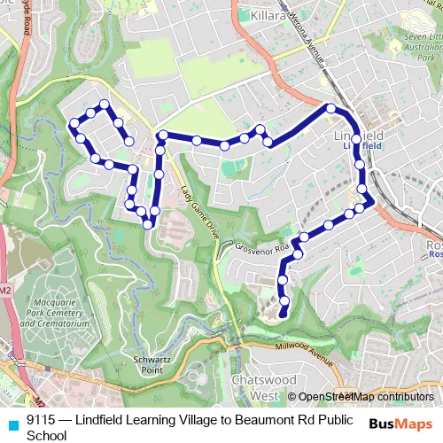 The first stop of the 9115 bus route is Lindfield Learning Village, Eton Rd and the last stop is Beaumont Rd At Anembo Cres. 9115 (Lindfield Learning Village to Beaumont Rd Public School) is operational during on weekdays.