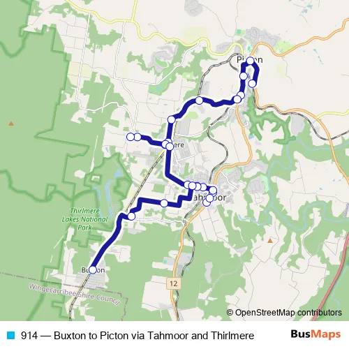 The first stop of the 914 bus route is Picton Station, Station St and the last stop is Buxton Shops, East Pde. 914 (Buxton to Picton via Tahmoor and Thirlmere) is operational during on weekdays.