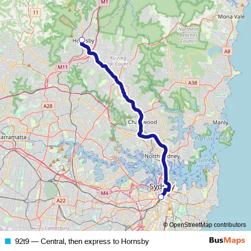 Bus 92t9 - Central, then express to Hornsby: Full Schedule in Sydney