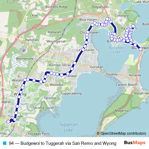 Click here to view the nearest 94 - Budgewoi to Tuggerah via San Remo and Wyong bus stop.