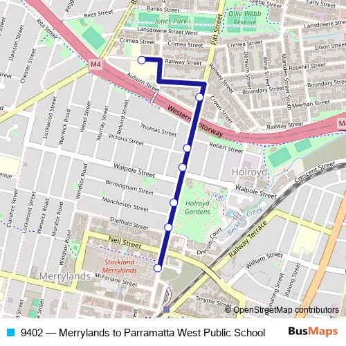 The first stop of the 9402 bus route is Stockland Merrylands, Pitt St and the last stop is Parramatta West Public School, Railway St. 9402 (Merrylands to Parramatta West Public School) is operational during on weekdays.