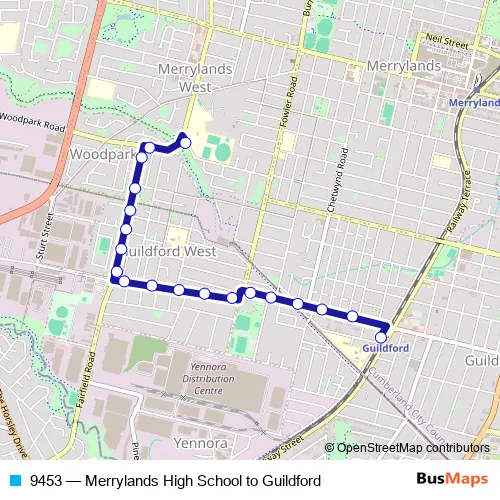 The first stop of the 9453 bus route is Bristol St Opp Merrylands High School and the last stop is Guildford Station, Military Rd. 9453 (Merrylands High School to Guildford) is operational during on weekdays.