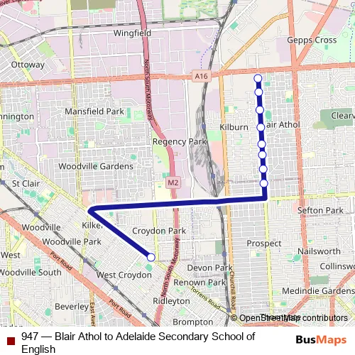 The first stop of the 947 bus route is Zone A Adelaide Secondary School of English and the last stop is Stop 23A Prospect Rd - West side. 947 (Blair Athol to Adelaide Secondary School of English) is operational during on weekdays.