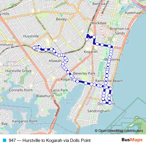 Click here to view the nearest 947 - Hurstville to Kogarah via Dolls Point bus stop.