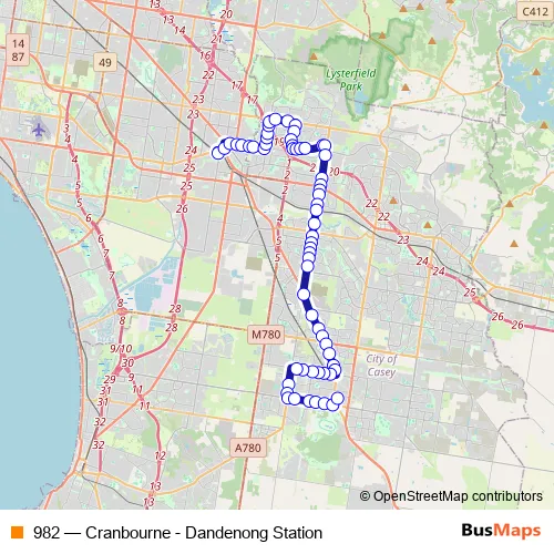 The first stop of the 982 bus route is Dandenong Station/Foster St and the last stop is Cranbourne Park SC/Lyall St. 982 (Cranbourne - Dandenong Station) is operational during on weekends.