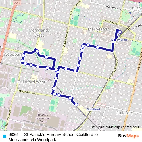 The first stop of the 9836 bus route is St Patrick's Primary School, Calliope St and the last stop is Merrylands Interchange, Terminal Pl - Stand 3. 9836 (St Patrick's Primary School Guildford to Merrylands via Woodpark) is operational during on weekdays.