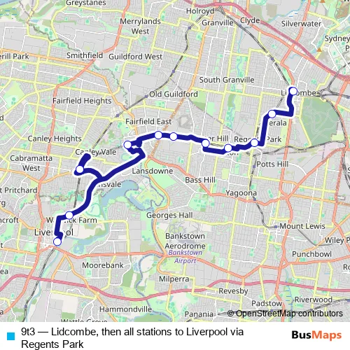 Click here to view the nearest 9t3 - Lidcombe, then all stations to Liverpool via Regents Park bus stop.