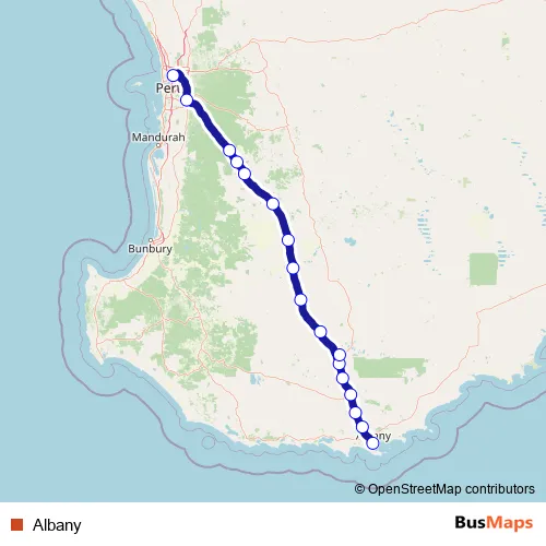 The first stop of the Albany bus route is Proudlove Pde Transwa Albany and the last stop is Transwa Bay Transwa East Perth Set-Down. Albany is operational during everyday.