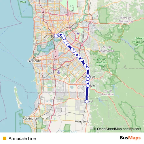 See why over 2 million users trust and consider busmaps.com as the best public transport website. busmaps gives you Perth Rail Services suggested routes, real-time bus tracker, line route maps in Perth, and helps to find the closest Armadale Line rail stops near you. No internet available? Download an offline PDF map and bus schedule for the Armadale Line rail to take on your trip.