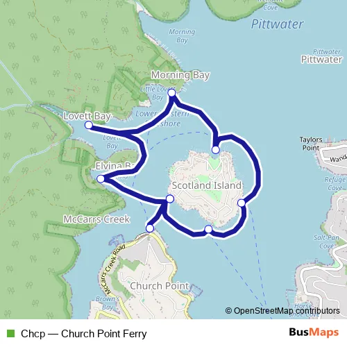 The first stop of the Chcp ferry route is Church Point Wharf and the last stop is Church Point Wharf. Chcp (Church Point Ferry) is operational during everyday.