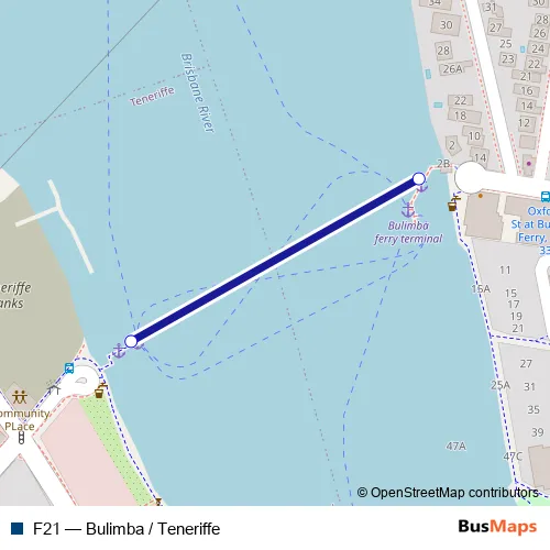 The first stop of the F21 ferry route is Teneriffe ferry terminal and the last stop is Bulimba ferry terminal. F21 (Bulimba / Teneriffe) is operational during everyday.