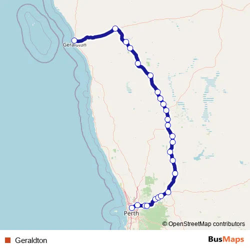 The first stop of the Geraldton bus route is Transwa Bay Transwa East Perth and the last stop is Transwa Bay Transwa Geraldton. Geraldton is operational during on weekdays.