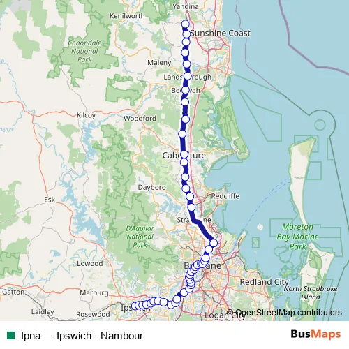 The first stop of the Ipna rail route is Ipswich station, platform 1 and the last stop is Nambour station, platform 2. Ipna (Ipswich - Nambour) is operational during everyday.