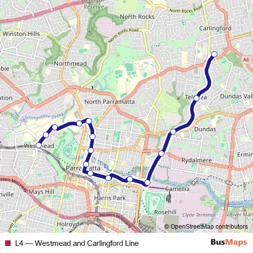 The first stop of the L4 tram route is Westmead Light Rail and the last stop is Carlingford Light Rail. L4 (Westmead and Carlingford Line) is operational during everyday.