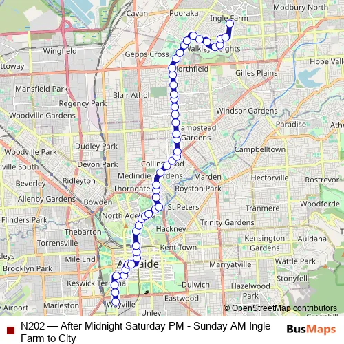 The first stop of the N202 bus route is Stop 2 Goodwood Rd - West side and the last stop is Stop 35A Walkleys Rd - West side. N202 (After Midnight Saturday PM - Sunday AM Ingle Farm to City) is operational during on weekends.