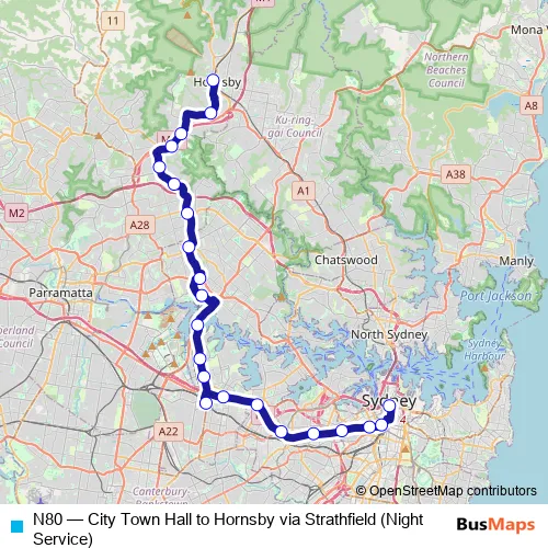 Bus N80 - City Town Hall to Hornsby via Strathfield (Night Service) in Sydney: Stops & Timetable
