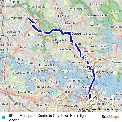 The first stop of the N91 bus route is Macquarie Centre, Stand B and the last stop is Town Hall, Park St, Stand H. N91 (Macquarie Centre to City Town Hall (Night Service)) is operational during everyday.