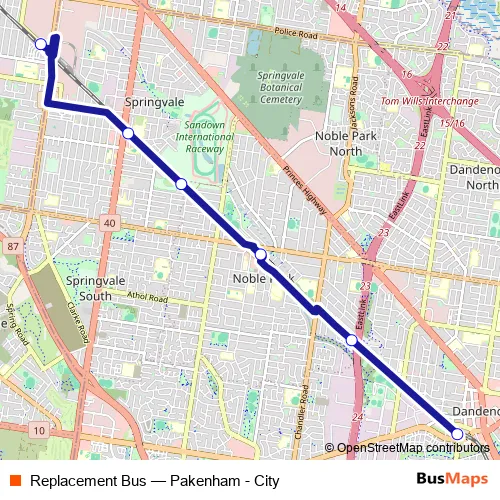 The first stop of the Replacement Bus metro route is Westall Rail Replacement Bus Stop and the last stop is Dandenong Rail Replacement Bus Stop. Replacement Bus (Pakenham - City) is operational during on weekends.