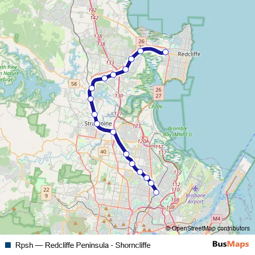 The first stop of the Rpsh rail route is Kippa-Ring station, platform 2 and the last stop is Northgate station, platform 2. Rpsh (Redcliffe Peninsula - Shorncliffe) is operational during everyday.