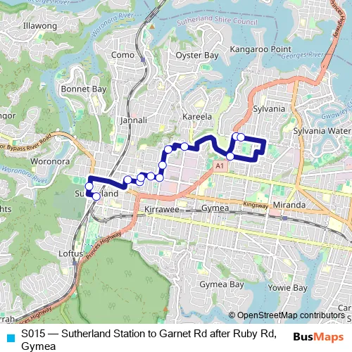 The first stop of the S015 bus route is Sutherland Station, Stand A and the last stop is Garnet Rd At Princes Hwy. S015 (Sutherland Station to Garnet Rd after Ruby Rd, Gymea) is operational during on weekdays.
