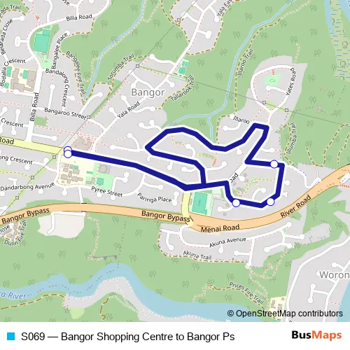 The first stop of the S069 bus route is Menai Rd Opp Dandarbong Av and the last stop is Menai Rd At Dandarbong Av. S069 (Bangor Shopping Centre to Bangor Ps) is operational during on weekdays.