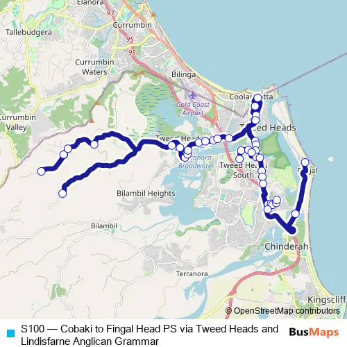 The first stop of the S100 bus route is Cobaki Rd Opp Bush Cherry Dr and the last stop is Fingal Head Public School, Prince St. S100 (Cobaki to Fingal Head PS via Tweed Heads and Lindisfarne Anglican Grammar) is operational during on weekdays.