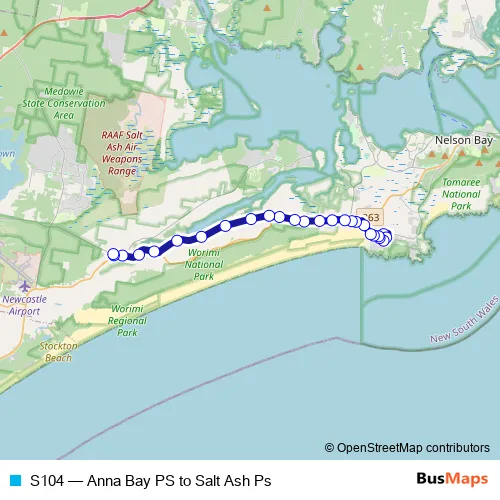 The first stop of the S104 bus route is Anna Bay Public School, Gan Gan Rd and the last stop is Salt Ash Public School, Cecilia Cl. S104 (Anna Bay PS to Salt Ash Ps) is operational during on weekdays.