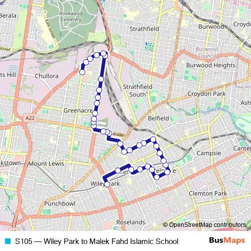 The first stop of the S105 bus route is Wiley Park Public School, King Georges Rd and the last stop is Malek Fahd Islamic School, Waterloo Rd. S105 (Wiley Park to Malek Fahd Islamic School) is operational during on weekdays.