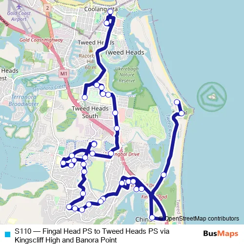The first stop of the S110 bus route is Fingal Head Public School, Prince St and the last stop is Tweed Heads Public School, Stuart St. S110 (Fingal Head PS to Tweed Heads PS via Kingscliff High and Banora Point) is operational during on weekdays.