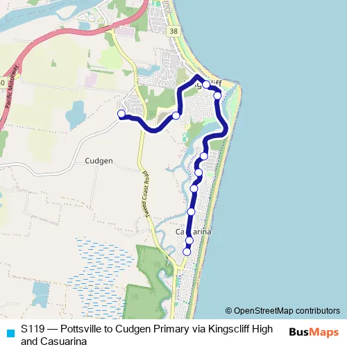 The first stop of the S119 bus route is Casuarina Way Opp Ebony Ct and the last stop is Cudgen Primary School, Collier St. S119 (Pottsville to Cudgen Primary via Kingscliff High and Casuarina) is operational during on weekdays.