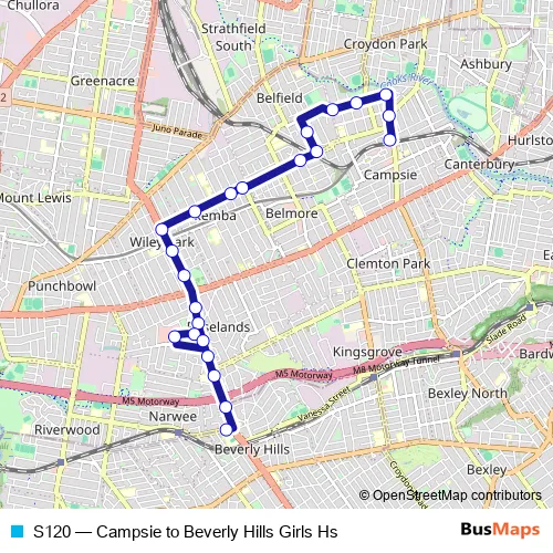 The first stop of the S120 bus route is Campsie Station, North Pde, Stand G and the last stop is Beverly Hills Girls High School, Broadarrow Rd. S120 (Campsie to Beverly Hills Girls Hs) is operational during on weekdays.