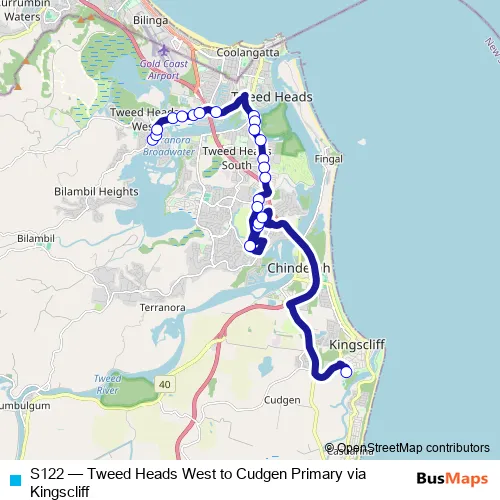 The first stop of the S122 bus route is Scenic Dr Before Gollan Dr and the last stop is Kingscliff High School, Oxford St. S122 (Tweed Heads West to Cudgen Primary via Kingscliff) is operational during on weekdays.