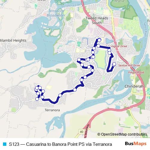 The first stop of the S123 bus route is Terranora Public School, Henry Lawson Dr and the last stop is Banora Point Public School, Pioneer Pde, Stand A. S123 (Casuarina to Banora Point PS via Terranora) is operational during on weekdays.
