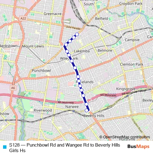 The first stop of the S128 bus route is Punchbowl Rd After Wangee Rd and the last stop is Beverly Hills Girls High School, Broadarrow Rd. S128 (Punchbowl Rd and Wangee Rd to Beverly Hills Girls Hs) is operational during on weekdays.