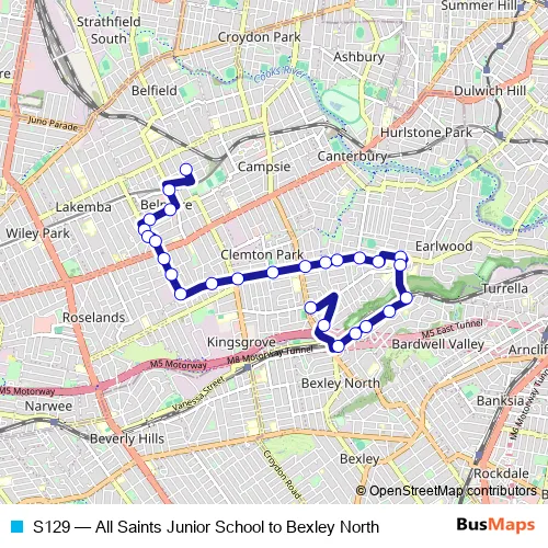 The first stop of the S129 bus route is All Saints Grammar Primary Campus, Cecilia St and the last stop is Homer St Before Bexley Rd. S129 (All Saints Junior School to Bexley North) is operational during on weekdays.
