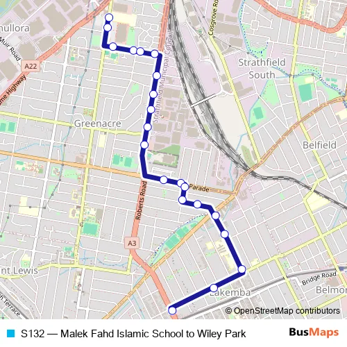 The first stop of the S132 bus route is Malek Fahd Islamic School, Waterloo Rd and the last stop is King Georges Rd At Lakemba St. S132 (Malek Fahd Islamic School to Wiley Park) is operational during on weekdays.