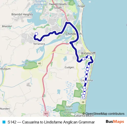 The first stop of the S142 bus route is Casuarina Way Before Lambent Av and the last stop is Lindisfarne Anglican Grammar School. S142 (Casuarina to Lindisfarne Anglican Grammar) is operational during on weekdays.