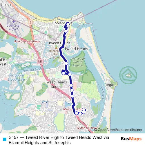 The first stop of the S157 bus route is Tweed Heads Public School, Stuart St and the last stop is Bentley Way At Laura St. S157 (Tweed River High to Tweed Heads West via Bilambil Heights and St Joseph's) is operational during on weekdays.