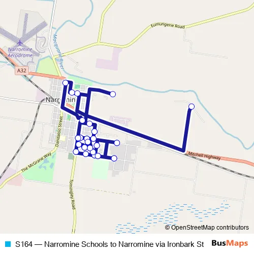 The first stop of the S164 bus route is Narromine Public School, Meringo St and the last stop is High Park Rd At River Dr. S164 (Narromine Schools to Narromine via Ironbark St) is operational during on weekdays.