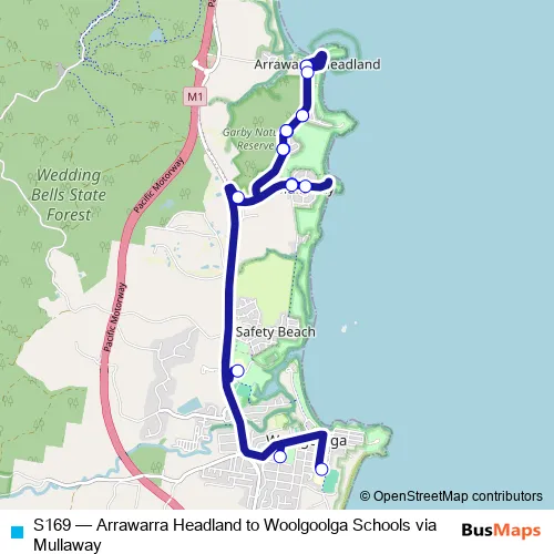 The first stop of the S169 bus route is Arrawarra Rd Opp Ocean View Rd and the last stop is Woolgoolga Primary School, Scarborough St. S169 (Arrawarra Headland to Woolgoolga Schools via Mullaway) is operational during on weekdays.