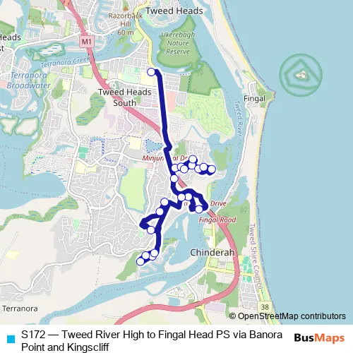 The first stop of the S172 bus route is Tweed River High School, Heffron St and the last stop is Banora Point Public School, Pioneer Pde, Stand B. S172 (Tweed River High to Fingal Head PS via Banora Point and Kingscliff) is operational during on weekdays.