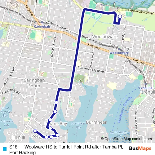 The first stop of the S18 bus route is Woolooware High School, Restormel St and the last stop is Turriell Point Rd Opp Mookara Pl. S18 (Woolware HS to Turriell Point Rd after Tamba Pl, Port Hacking) is operational during on weekdays.