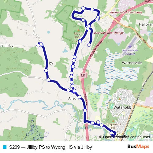 The first stop of the S209 bus route is Jilliby Public School, Jilliby Rd and the last stop is Wyong High School, Alison Rd. S209 (Jilliby PS to Wyong HS via Jilliby) is operational during on weekdays.