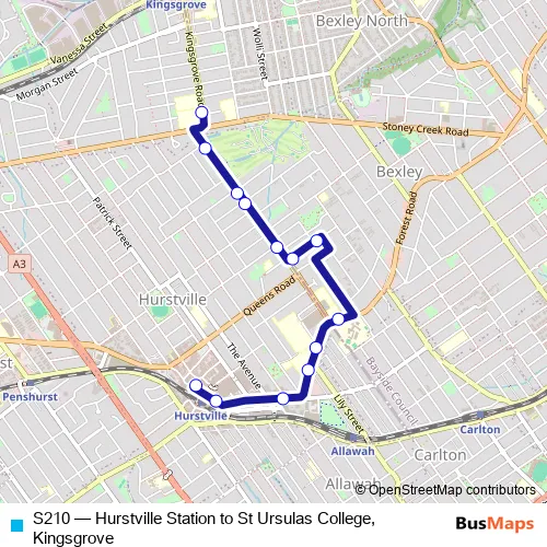 The first stop of the S210 bus route is Hurstville Station, Stand A and the last stop is Kingsgrove High School, Kingsgrove Rd. S210 (Hurstville Station to St Ursulas College, Kingsgrove) is operational during on weekdays.