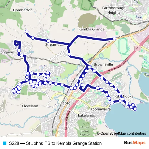 The first stop of the S228 bus route is St Johns Public School, Moombara St and the last stop is Kembla Grange Station, West Dapto Rd. S228 (St Johns PS to Kembla Grange Station) is operational during on weekdays.