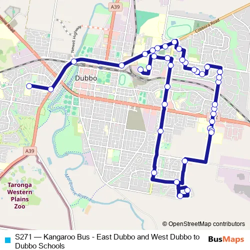 The first stop of the S271 bus route is White St Opp Dubbo Buslines Depot and the last stop is Dubbo College Delroy Campus, East St. S271 (Kangaroo Bus - East Dubbo and West Dubbo to Dubbo Schools) is operational during on weekdays.