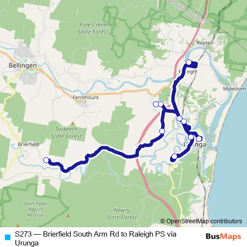 The first stop of the S273 bus route is 1195 South Arm Rd and the last stop is Raleigh Public School, North St. S273 (Brierfield South Arm Rd to Raleigh PS via Urunga) is operational during on weekdays.